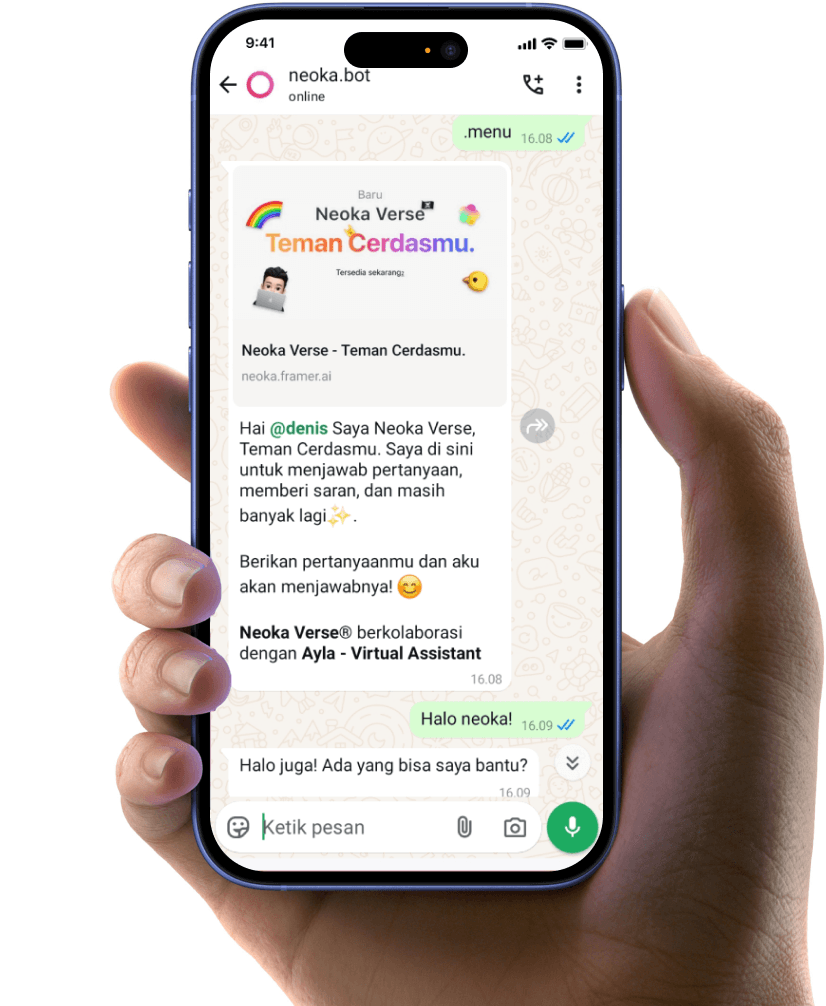 Neoka Chatbot adalah asisten virtual untuk membantu-mu dalam melakukan sesuatu, seperti bertanya, menjawab dan memberi saran.